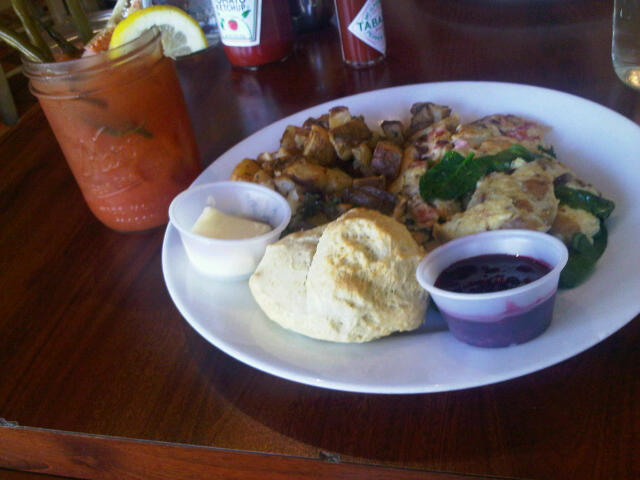 | Smoked Bacon, Spinach, Carmelized Onion, Tomato & Gouda Cheese Scramble w/ House Potatoes and Buttermilk biscuit with Virgin Mary. |