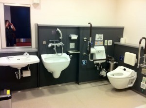 | It’s probably not as high tech as it looks, but this disabled toilet resembles a bathroom from the future. In outer space. |