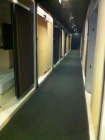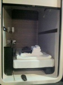 Your Designated sleepz for the night is installed in a large high wall, where there are perhaps fifteen other such holes in the wall, ready to entrap the tired, withered bodies of naive travellers. Cold, white lighting line the edges, and a short ladder is installed against the wall so that you may climb and shimmy to your designated hole. A cloth curtain which you can hook into place from the inside of the hole protects your privacy – the entire decor can be described as minimalist, sterile, and possibly aboard the Starship Enterprise.