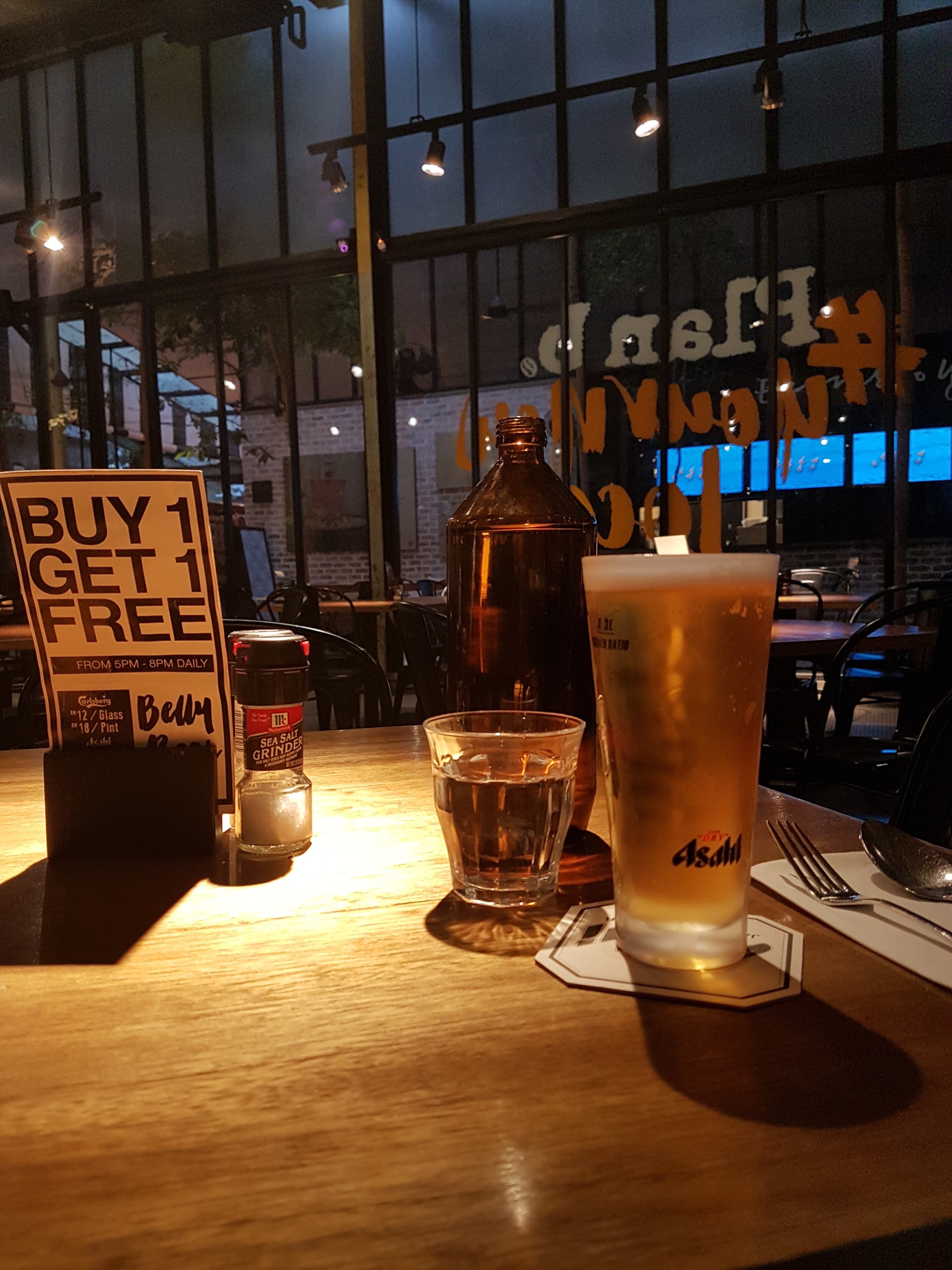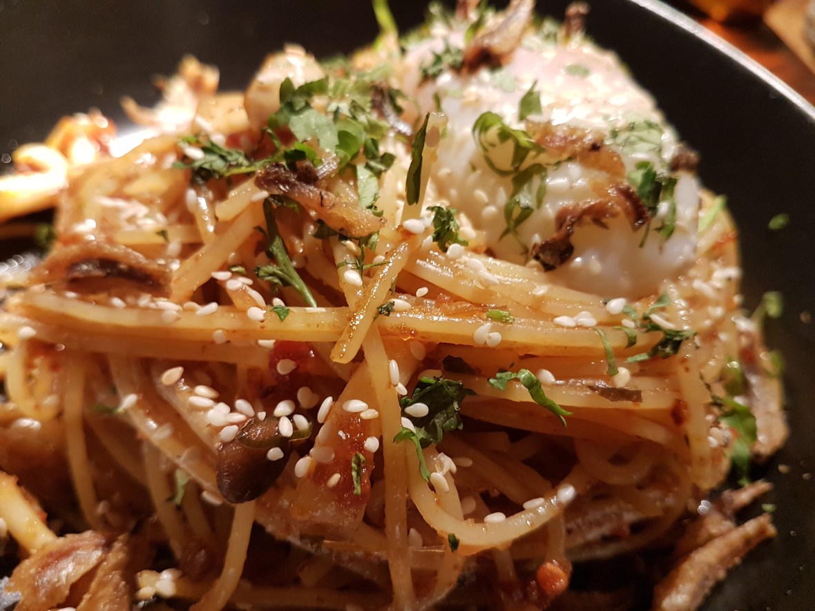 Asahi beer (“we have a buy one get one free promotion!” *looks reluctant* “oh..uh..really? Ok..”) and Malay fusion style spagliatelle (whatever that is) with shiitake mushrooms.