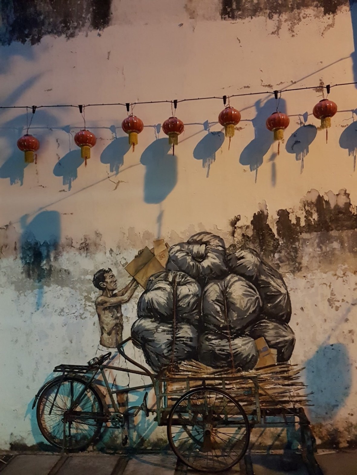 Reaching the proper Old Town, and really hoping that the art would get better, I did a quick stroll through the “Concubine Lanes” . They run parallel to each other, and it is said that some dirt rich merchant with an even dirtier love life gifted a ‘lane’ to each of his three concubines. Back in the day, these dingey little backstreets were a hot pot of booze, opium, and mistresses lounging around, having been put up by their well-to-do lovers. Red lanterns and pink umbrellas (yeh, dunno) hang strewn across the narrow alleys, and there are a few semi-decent murals painted.
